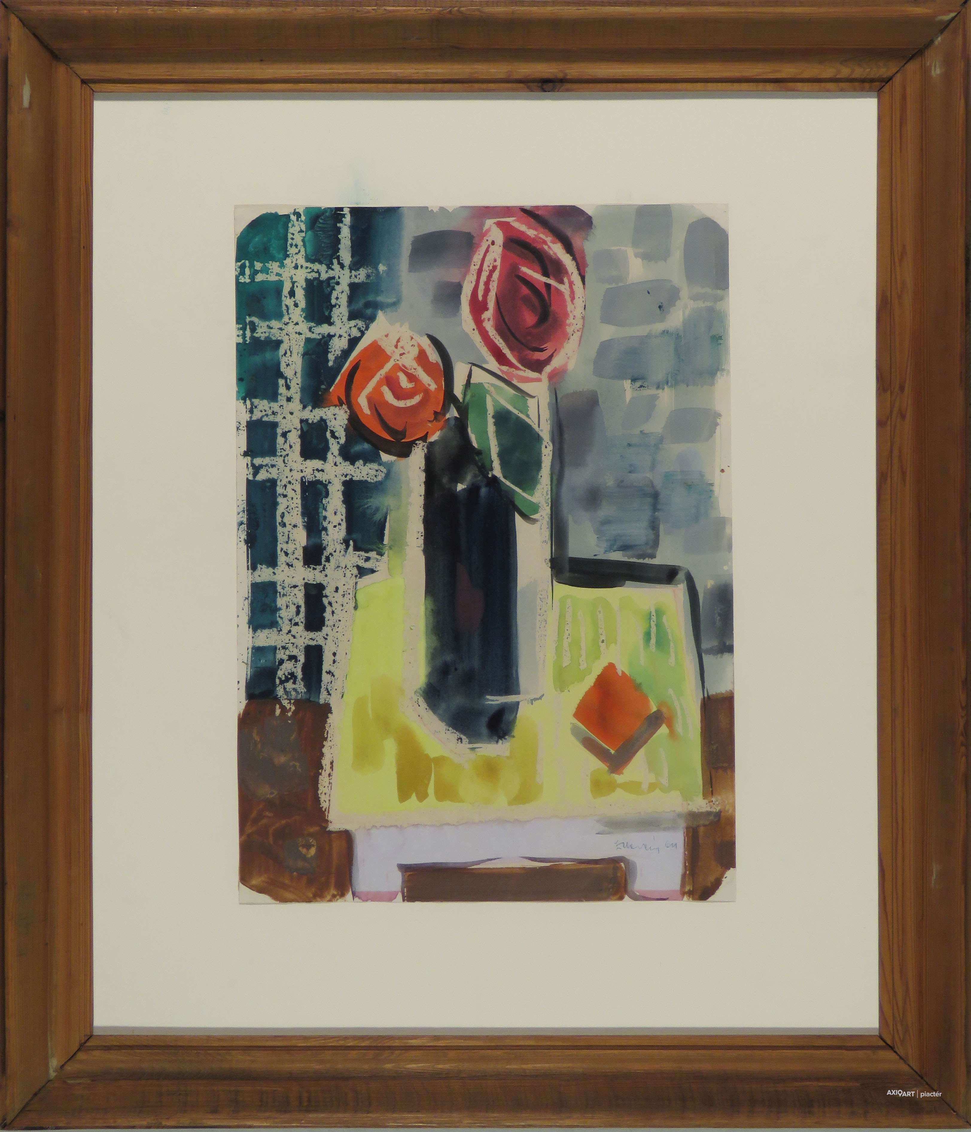 [FKD049/Bp9/42] A kép mérete: 73 x 102 cm keret nélkül. Készült: Akrill, Papír A kép Vinkler László (Szabadka, 1912, Szeged, 1980) alkotása. Jelezve jobbra lent "Vinkler László" A festmény jó állapotban van. Keret: Ép Magyar festők és grafikusok életrajzi lexikona I-II. Festő. Tanulmányait Lápossy-Hegedűs Géza irányításával kezdte. A budapesti Képzőművészeti Főiskolán Glatz Oszkár és Karlovszky Bertalan tanítványa volt. 1935-ben diplomázott. 1933-ban a főiskola jubileumi tárlatán a "Nagymamám" című alkotásával elnyerte a Balló-díjat. 1935-1936-ban római ösztöndíjas volt, és a Collegium Hungaricum-ban töltött nyolc hónapot. Szorgalmasan dolgozott, közben tanulmányokat folytatott az Accademia delle Belle Arti freskó-osztályán, Ferazzi irányítása mellett. Az itt készült "Maria Surigia" című képmását 1936-ban a Collegium Hungaricum kiállításán mutatta be, amelyet az olasz állam vásárolt meg. A "Római szobrásznő" című képe 1937-ben elnyerte a Jellinek-díjat. Az alkotás jelenleg a Magyar Nemzeti Galéria tulajdona. Számos kelet- és nyugat-európai országban járt tanulmányúton. 1931-től szerepelt hazai és külföldi bemutatókon. Egyéni kiállításai voltak Szegeden (1942, 1958, 1963, 1972), az Ernst Múzeumban (1959), Olaszországban (1961), Jugoszláviában (1968). Nagyobb anyaggal szerepelt a szegedi művészek 1967-es Magyar Nemzeti Galéria-béli kiállításán. 1932-ben Balló-díjat, 1937-ben Fényes Adolf-díjat kapott, 1972-ben Szeged város alkotói-díját, 1979-ben a Szegedi Nyári Tárlat díját nyerte el. Éveken keresztül (tizenöt év megszakítással) a szegedi Tanárképző Főiskola rajzi tanszékének vezetőjeként működött. Korábban protréfestőként volt ismeretes. Karlovszky mellett a rajz kultuszára és a csendéleti formalátásra kapott indíttatásokat, később Glatz hatott rá, így a rajzos analizálás helyett a művész a szélesebb festőiségre tért át. A naturalizmussal elvi szakítást jelentő harmadik stílusát a novocento jelképes, színesen dekoratív szellemében alakította ki. Jeles grafikus volt. Több irodalmi művet illusztrált. Monumentális feladatokkal is foglalkozott (freskók a Petőfi-telepi templomban stb.). 1957-ben a városban végzett művészi tevékenysége elismerésül a szegedi Collegium Artium Képzőművészeti tagozata vezetőjévé választotta. Műveinek jelentős részét a szegedi Móra F. Múzeum őrzi. (PZ-SzMF,D.E.: Műv. 1927/6, ML, Sz.Z.: Műv. 1973/1, Műv. 1982/10. D.F.Zs.: Műv. 1973/8.) Magyar festők és grafikusok életrajzi lexikona I-II. Műgyűjtők és kereskedők kézikönyve Festő. Tanulmányait Lápossy-Hegedűs Géza irányításával kezdte. A budapesti Képzőművészeti Főiskolán Glatz Oszkár és Karlovszky Bertalan tanítványa volt. 1931 óta kiállító művész. 1933-ban a főiskola jubileumi kiállításán a "Nagymamám" c. festményével elnyerte a Balló-díjat. 1935-36-ban római ösztöndíjas volt. Az Accademia della Bella Arti freskó-osztályán, Ferazzi mester mellett folytatott tanulmányokat. Az itt készült "Maria Surigia" c. portréját 1936-ban a Collegium Hungaricum kiállításán mutatta be, amelyet az olasz állam vásárolt meg. A "Római szobrásznő" c. képe 1937-ben elnyerte a Jellinek-díjat. A mű a MNG tulajdona. Több kelet- és nyugat-európai országban járt tanulmányúton. Egyéni kiállításai voltak Szegeden (1942, 1958, 1963, 1972), az Ernst Múzeumban (1959), Olaszországban (1961), Jugoszláviában (1968). Nagyobb anyaggal szerepelt a szegedi művészek 1967-es MNG-beli kiállításán. 1937-ben Fényes Adolf-díjat, 1972-ben elnyerte Szeged város alkotói-díját, 1979-ben a Szegedi Nyári Tárlat díját. Ezen kívül művészpedagógusi és alkotói tevékenysége elismeréseként még számos kitüntetéssel és díjjal jutalmazták. Hosszabb ideig a szegedi Tanárképző Főiskola rajztanszékének vezetőjeként tevékenykedett. Korábban arcképfestőként volt ismeretes. Karlovszky mellett a rajz kultuszára és a csendéleti formalátásra kapott indíttatásokat, később Glatz Oszkár hatott rá és a rajzos analizálás helyett a szélesebb festőiségre tért át. A naturalizmussal elvi szakítást jelentő harmadik stílusát a novocento jelképes, színesen dekoratív szellemében alakította ki. Jeles grafikus volt. Számos irodalmi művet illusztrált. Monumentális feladatokkal is foglalkozott. (freskók a Petőfi-telepi templomban, stb). (PZ-SzMF,ML,Sz.Z.: Műv.-1982/10) Magyar festők és grafikusok adattára Művészeti tanulmányait Lápossy-Hegedűs Géza irányításával kezdte, majd a Képzőművészeti Főiskolán Karlovszky Bertalan és Glatz Oszkár növendékeként fejezte be 1935-ben. 1931 óta kiállító művész. 1933-ban a főiskola jubileumi kiállításán a Nagymamám c. festményével elnyerte a Balló-díjat. A diploma megszerzését követően 1935-1936-ban római ösztöndíjas. Az itt készült Maria Surigia c. portréját az olasz állam megvásárolta. A Római szobrásznő c. képe 1937-ben elnyerte a Jellinek-díjat, s amelyet ma az MNG őriz. Számos kelet- és nyugat-európai országban megfordult tanulmányúton. Egyéni kiállításai voltak Szegeden (1942, 1958, 1963, 1968, 1972), az Ernst Múzeumban (1959) és Dunaújvárosban (1977), illetve külföldön Olaszországban (1961) és Jugoszláviában (1968). Nagyobb anyaggal szerepelt a szegedi művészek 1967-ben MNG-beli bemutatóján. 1972-ben elnyerte Szeged város alkotói díját és 1979-ben a Szegedi Nyári Tárlat díját. Hosszabb időt töltött a Szegedi Tanárképző Főiskola rajztanszékének élén. Emlékkiállítását 1982-ben a szegedi Móra Ferenc Képtárban és a MNG-ban rendezték meg. Karlovszky mellett a rajz kultuszára és a csöndéleti formalátásra kapott indíttatásokat, később Glatz hatott rá és a rajzos anal