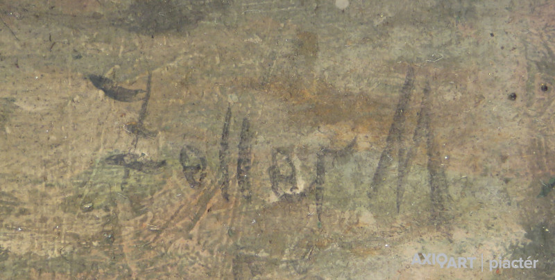 [FKA088/075] A kép mérete: 50 x 70 cm keret nélkül. Készült: Olaj, Falemez A kép Tolnay Ákos (Pest, 1861) alkotása. Jelezve balra lent "Tolnay Ákos" A festmény jó állapotban van. Keret: Sérült Magyar festők és grafikusok életrajzi lexikona I-II. Pest, 1861 - ? Festő. A bécsi akadémiáról ment a müncheni Képzőművészeti Akadémiára, ahol 1884-ben akadémiai bronzéremmel jutalmazták. Félbehagyva müncheni tanulmányait ár ebben az évben a Benczúr-mesteriskolába sietett, és itt képezte magát. Leginkább arcképeket festett, de kisebb tájképekkel is szerepelt kiállításokon. 1907-ben Budapesten, Aradon, stb. volt tárlata. A Benczúr Társaság tagja volt. Egy arcképtanulmánya a Magyar Nemzeti Galériában, Knezics Zoltán arcképe a főváros, Pucher József építész arcképe a Budapesti Építőmesterek Ipartestületének tulajdonában van. (Éber, L-MMM) Magyar festők és grafikusok adattára (Pest, 1861 - ) Bécsben és Münchenben tanult és leginkább arcképeket festett (Wekerle, Radocza, Csillag Teréz stb.), azon kívül kisebb tájképekkel is szerepelt a kiállításokon. 1907-ben Budapesten, Aradon stb. volt kiállítása. Egy arcképtanulmánya a Magyar Nemzeti Galériában, Knézics Zoltán arcképe a főváros, Pucher József építész arcképe a budapesti építőmesterek ipartestületének tulajdonába került. A Benczúr Társaság tagja volt. - MTA Művészeti lexikon I-II. festő, szül. Budapest 1861. aug. 10. Budapesten tanult és leginkább arcképeket festett (Wekerle, Radocza, Csillag Teréz stb.), azonkívül kisebb tájképekkel is szerepelt a kiállításokon. Kortárs magyar művészeti lexikon I-III. Pest, 1861 – Festő. Bécsben és Münchenben tanult. Leginkább arcképeket festett, de kisebb tájképekkel is szerepelt kiállításokon. 1907-ben Budapesten, Aradon, stb. volt tárlata. A Benczúr Társaság tagja volt. Egy arcképtanulmánya a Magyar Nemzeti Galériában, Knezics Zoltán arcképe a főváros, Pucher József építész arcképe a Budapesti Építőmesterek Ipartestületének tulajdonában van (Éber)