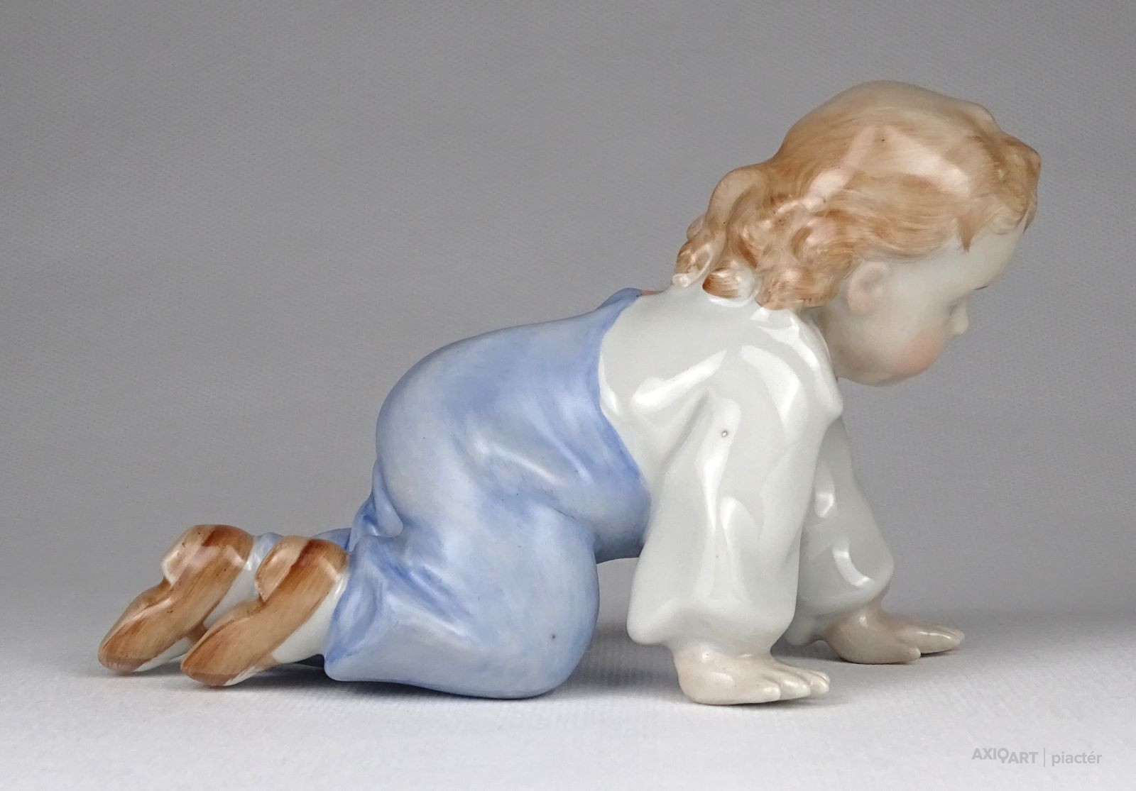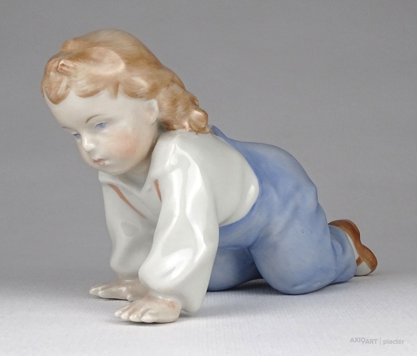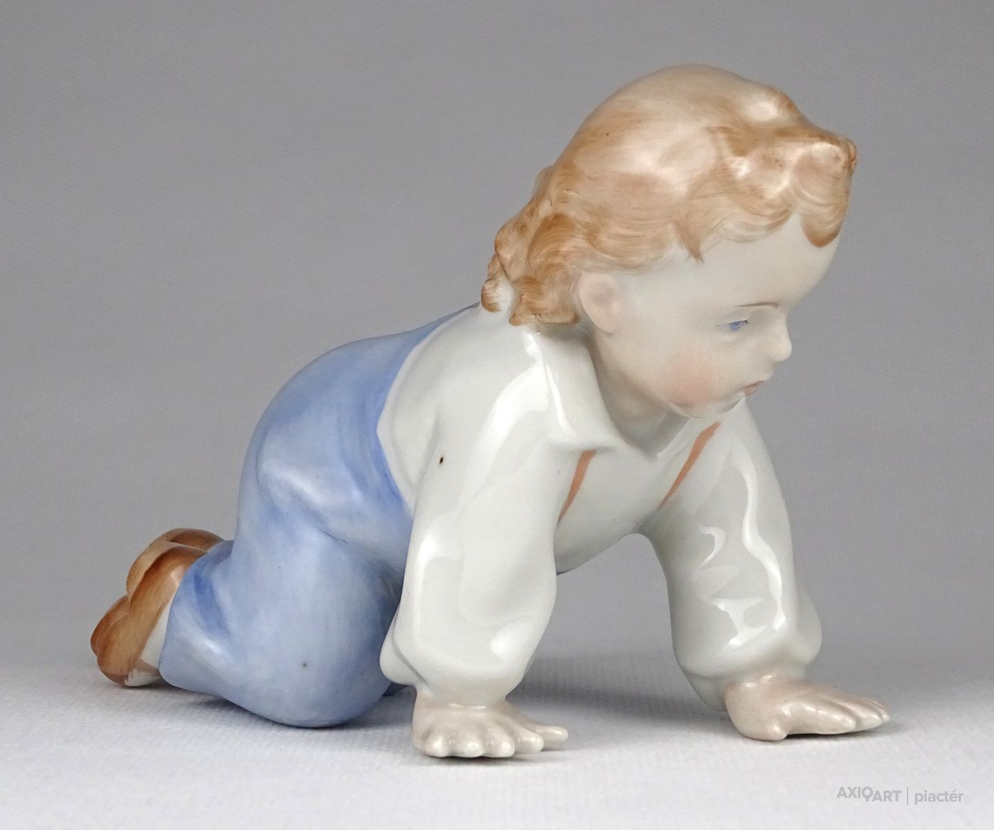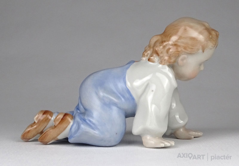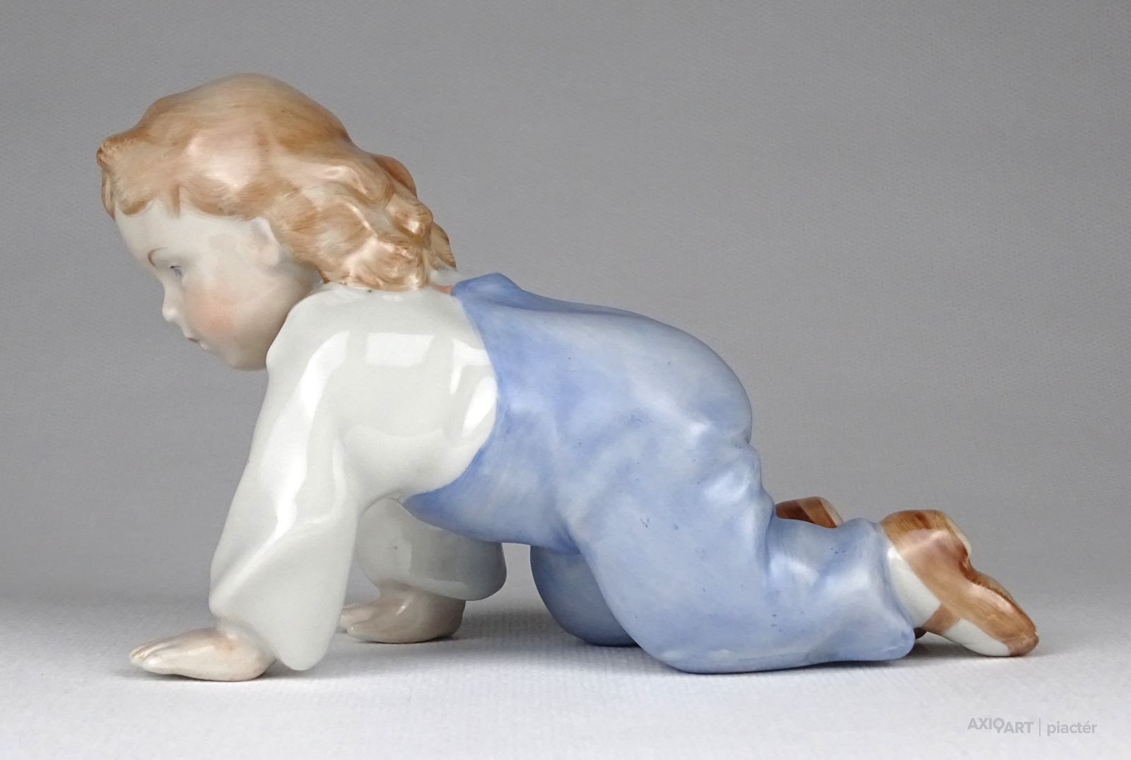 Kézi festésű Zsolnay porcelán figura, négykézláb mászó kislány.